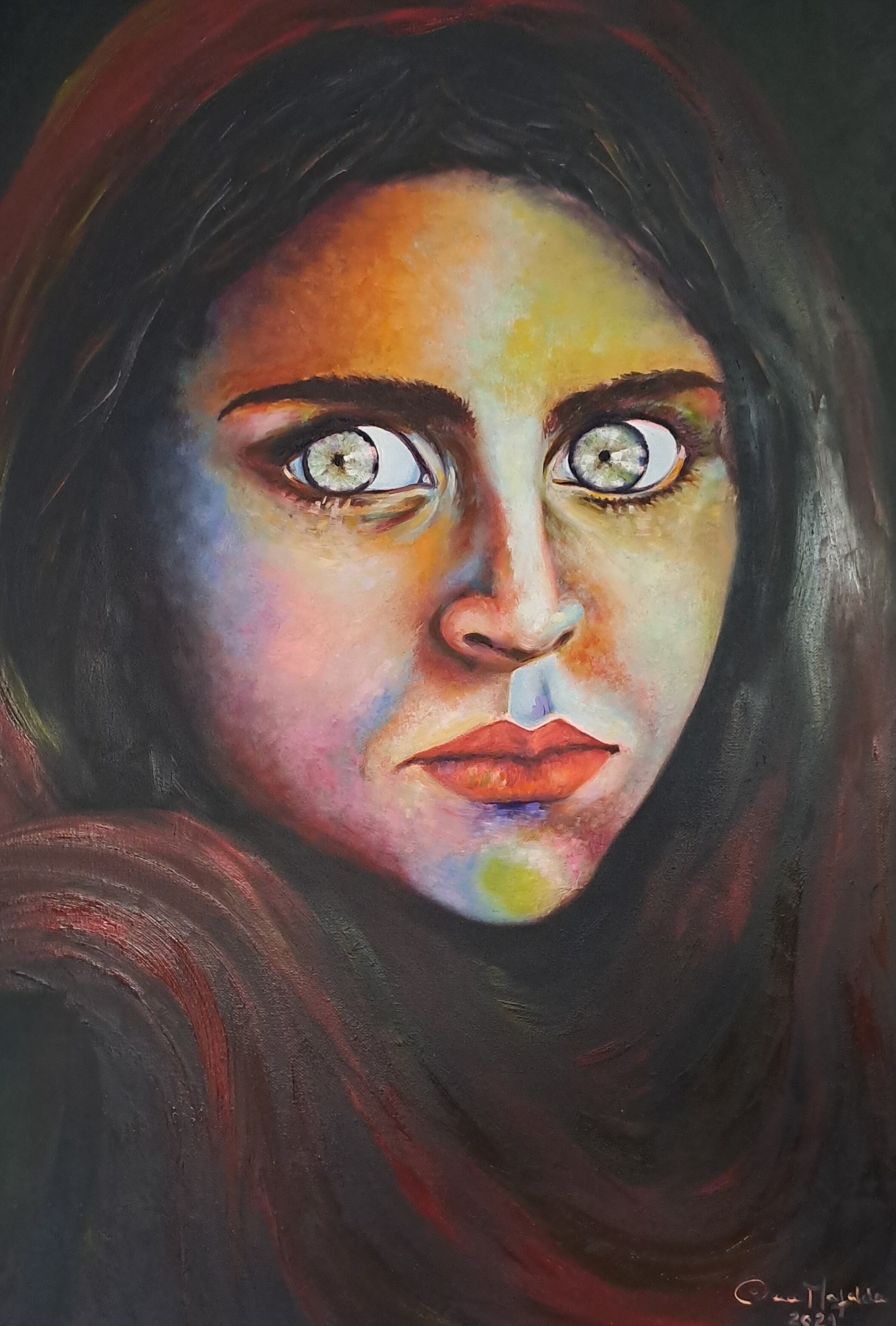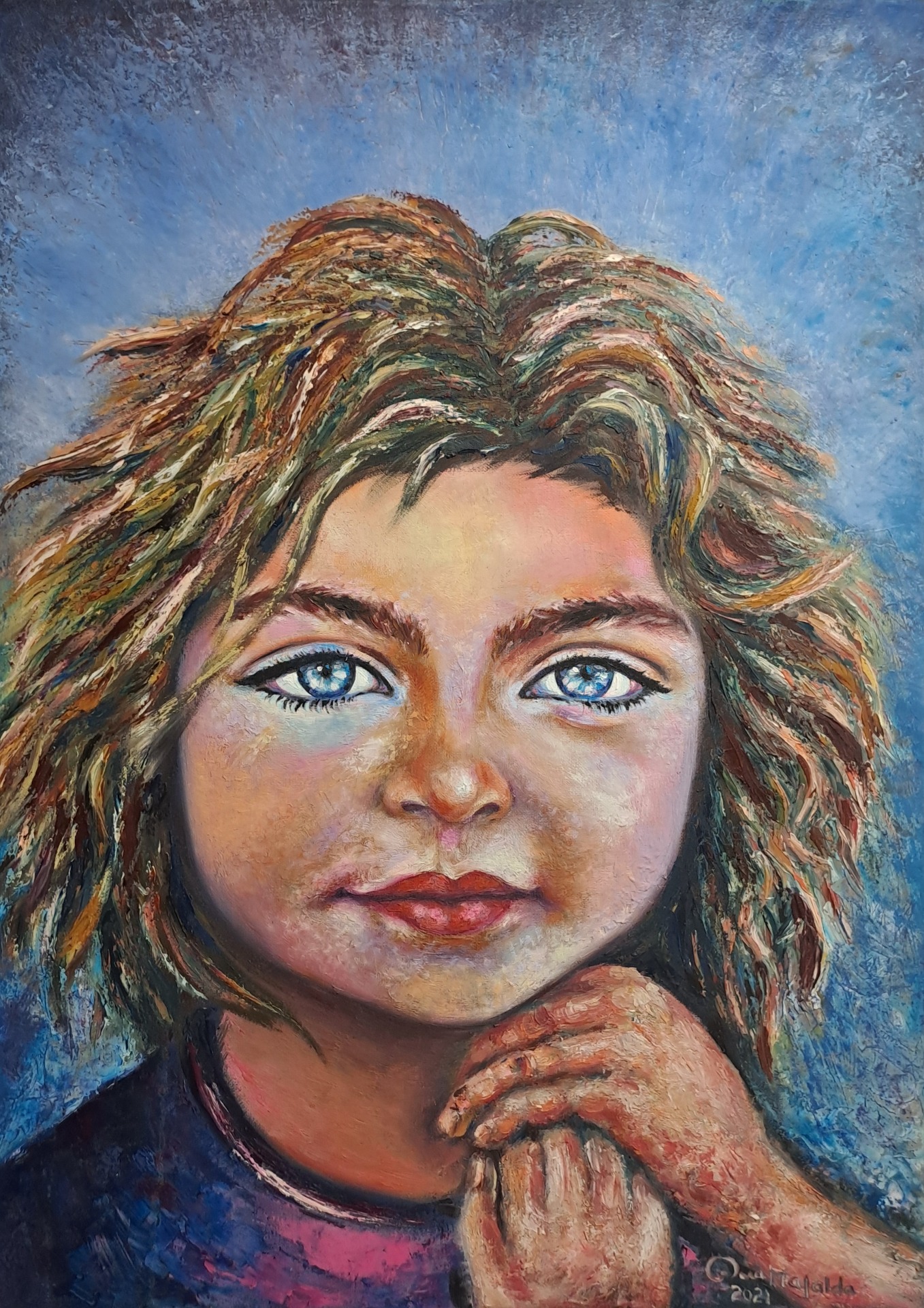 Textura e Matéria:Fiel à sua linguagem visual, Ana Mafalda utiliza a densidade do óleo para conferir volume aos cabelos e profundidade à pele. As pinceladas visíveis e o uso de texturas tácteis transformam o retrato numa peça vibrante, onde a luz parece emanar de dentro da própria tela.
