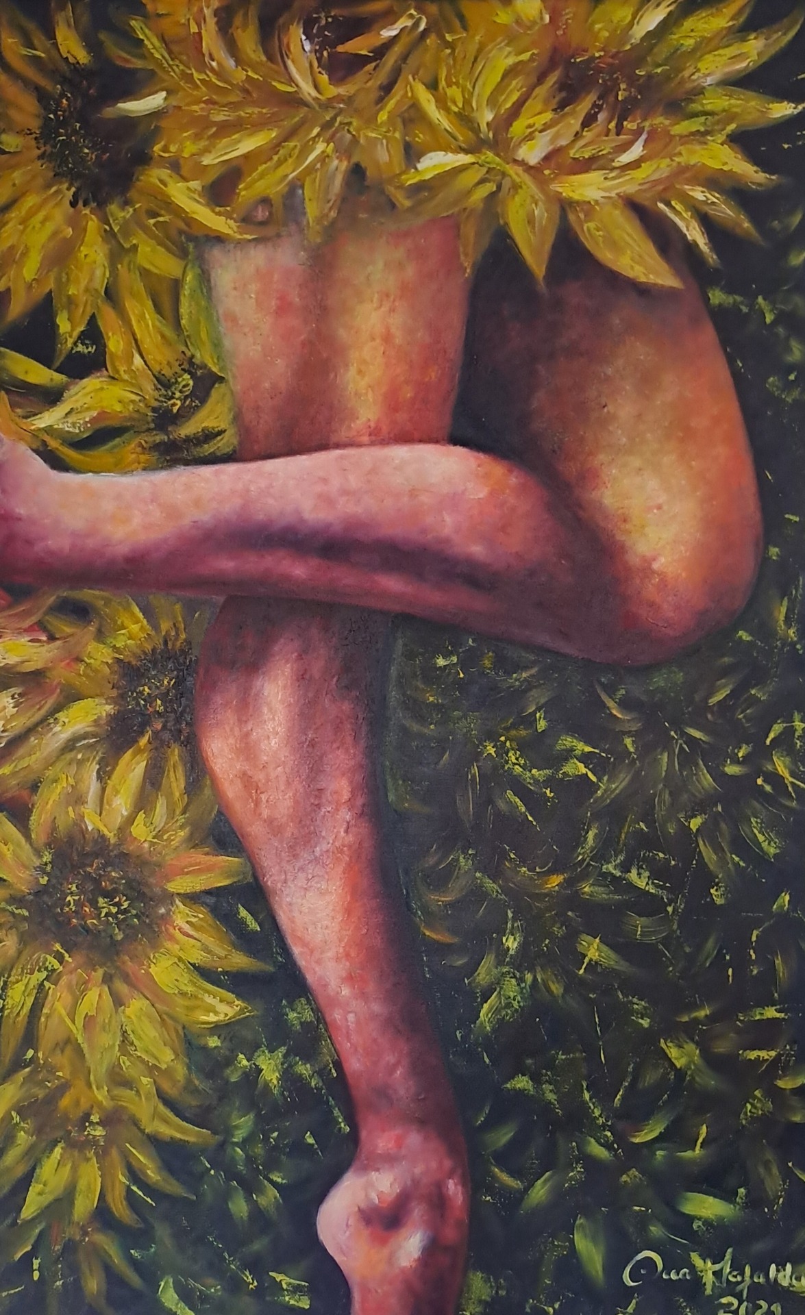 Em pintura a óleo, a matéria constrói-se em camadas densas, onde a cor envolve a forma e o fundo dialoga com o corpo. As flores não decoram: acolhem, contrastam, amplificam a presença. São peças únicas, assinadas, criadas para quem reconhece beleza na contenção e na poesia do movimento que permanece mesmo quando tudo parece parar.