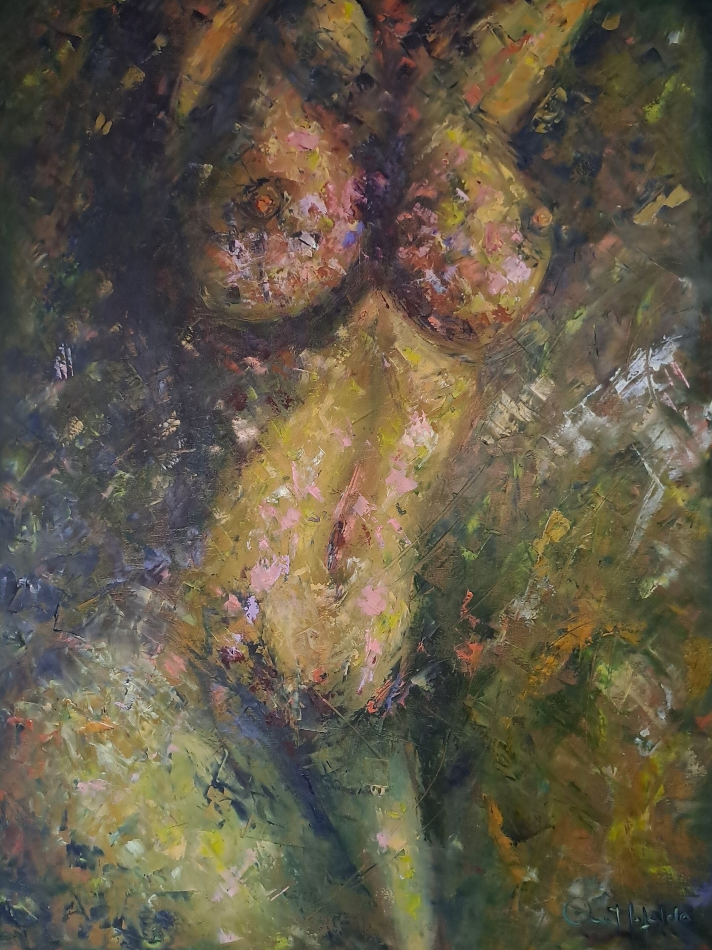 Em pintura a óleo, a forma constrói-se num equilíbrio entre revelação e ocultação. A cor surge como pulsação emocional, criando superfícies vivas, quase orgânicas. São peças únicas, assinadas, criadas para quem reconhece a beleza da origem e a potência do feminino sem filtros nem artifícios.