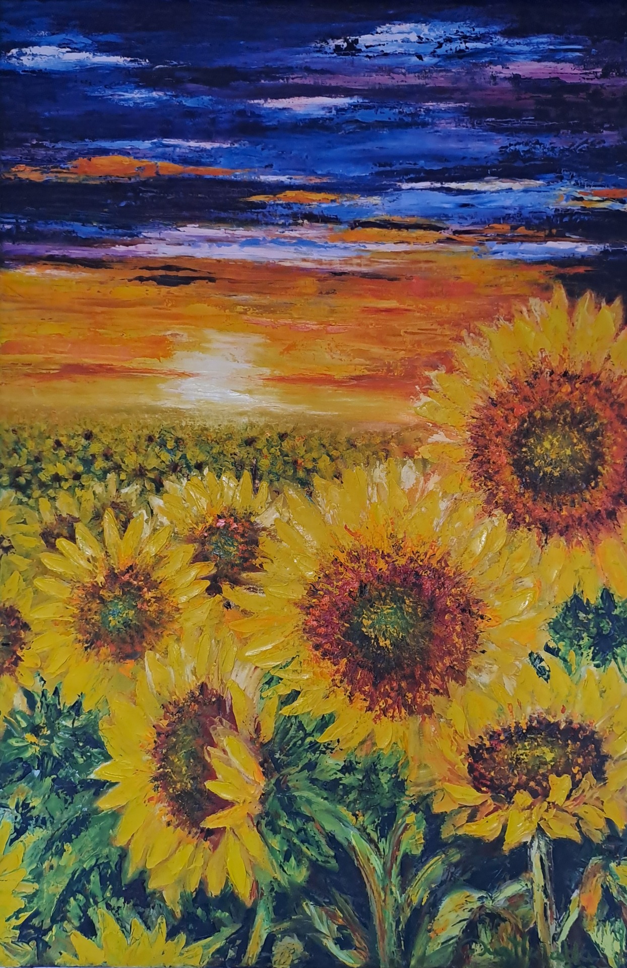 Cromatismo Vibrante: O uso audaz de tons quentes — laranjas, vermelhos e amarelos — em confronto com azuis e brancos profundos, cria um diálogo de luz e sombra que define a profundidade da obra. A cor não é apenas aplicada; é moldada para criar relevo e vida.
