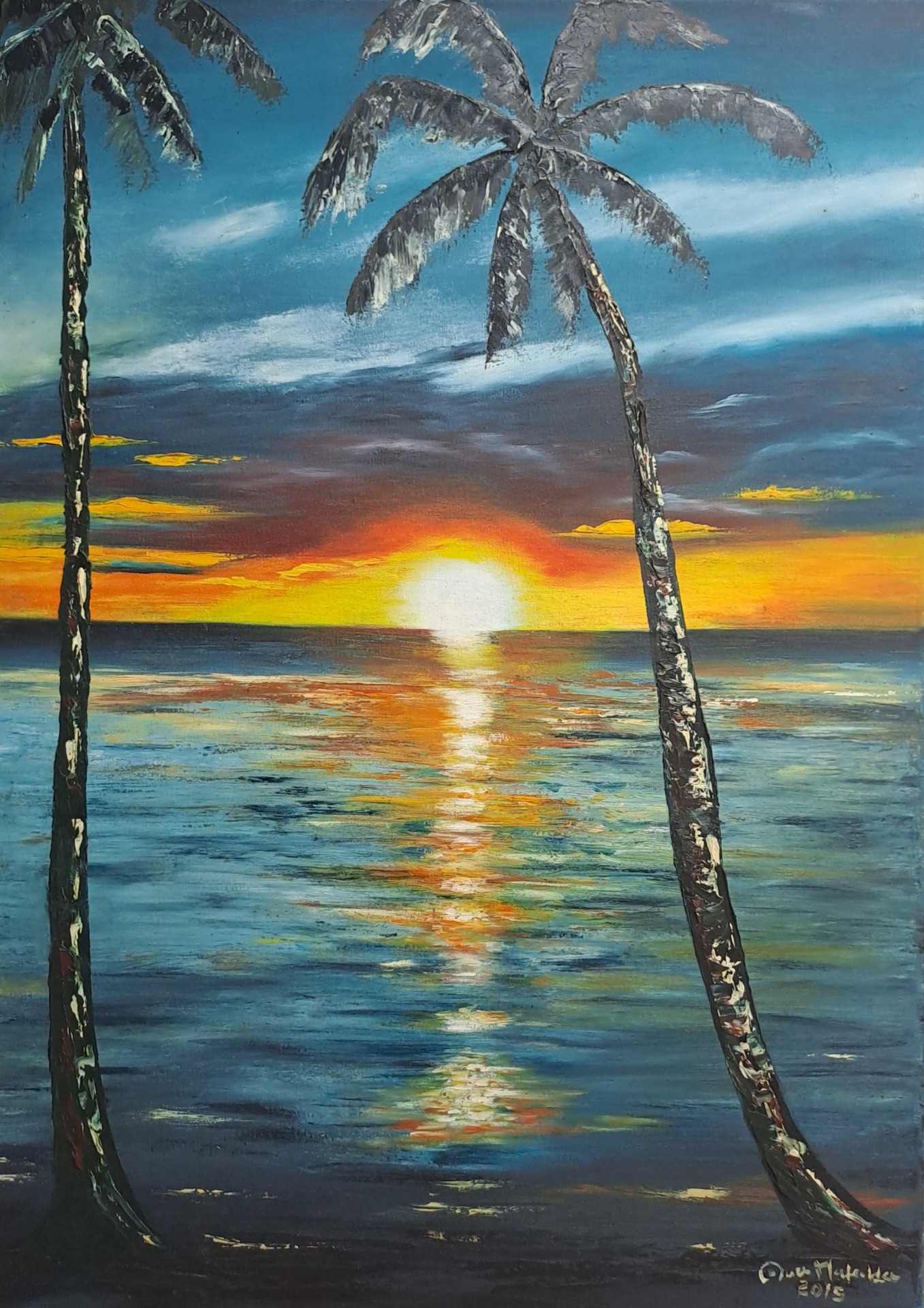 O Verão e a Exuberância: Em oposição, a artista transporta-nos para cenários tropicais onde o sol se torna o protagonista absoluto. O contraste entre o azul profundo do oceano e os tons quentes do poente reflete uma energia vibrante e expansiva. Aqui, as palmeiras moldam a composição, simbolizando a resistência e a vitalidade sob a luz intensa.